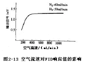 由图2-13可知空气最佳流速需大于300mL/min,一般采用空气与氢气该量比为1∶10左右。由于不同厂家不同型号的色谱仪配置的FID其喷口的内径不相同,其氢气、氮气和空气的最佳流量也不相同,可以参考说明书进行调节,但其原理是相同的。