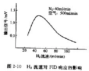 氢气作为燃烧气与氮气(载气)预混合后进入喷嘴当氮气流速固定时,随着氢气流速的蹭加,输出信号也随之增加,并达到一个最大值后迅速下降。如图2-10所示。由图可见:通常氢气的最佳流速为40~60mL/min。有时是氢气作为载气,氮气作为补充气,其效果是一样的。