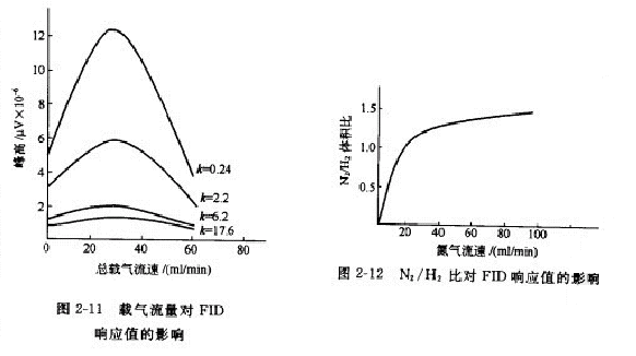 在我国多用N2作载气,H2作为柱后吹扫气进入检测器,对不同k值的化合物,氮气流速在一定范围增加时,其响应值也增加,在30mL/min左右达到一个最大值而后迅速下降,如图2-11所示。这是由于氮气流量小时,减少了火焰中的传导作用,导致火焰温度降低,从而减少电离效率,使响应降低;而氮气流量太大时,火焰因受高线速气流的干扰而燃烧不稳定,不仅使电离效率和收集效率降低,导致响应降低,同时噪声也会因火焰不稳定而响应增加。所以氮气一般采用流量在30mL/min左右,检测器可以得到较好的灵敏度。在用H2作载气时,N2作为柱后吹扫气与H2预混合后进入喷嘴,其效果也是一样的。